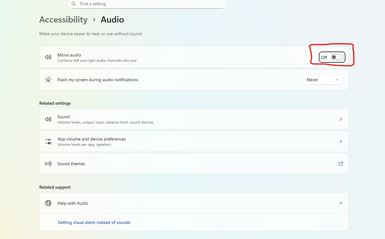 Ensure the "Mono audio" toggle is set to OFF to enable true stereo sound.