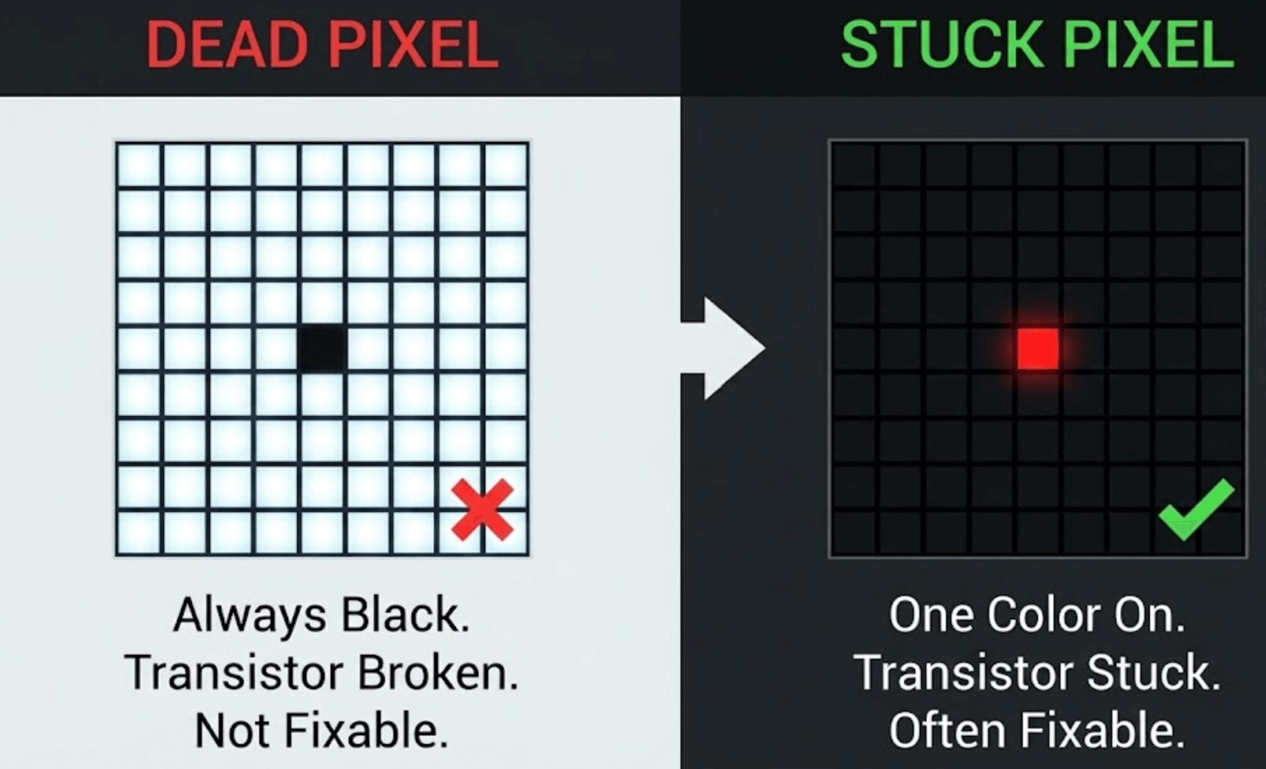 - Stuck Pixel (Fixable): The pixel is Red, Green, Blue, or Yellow.